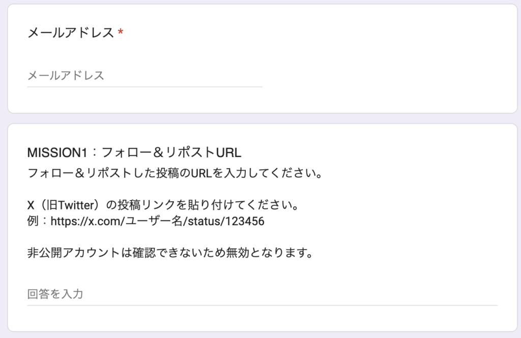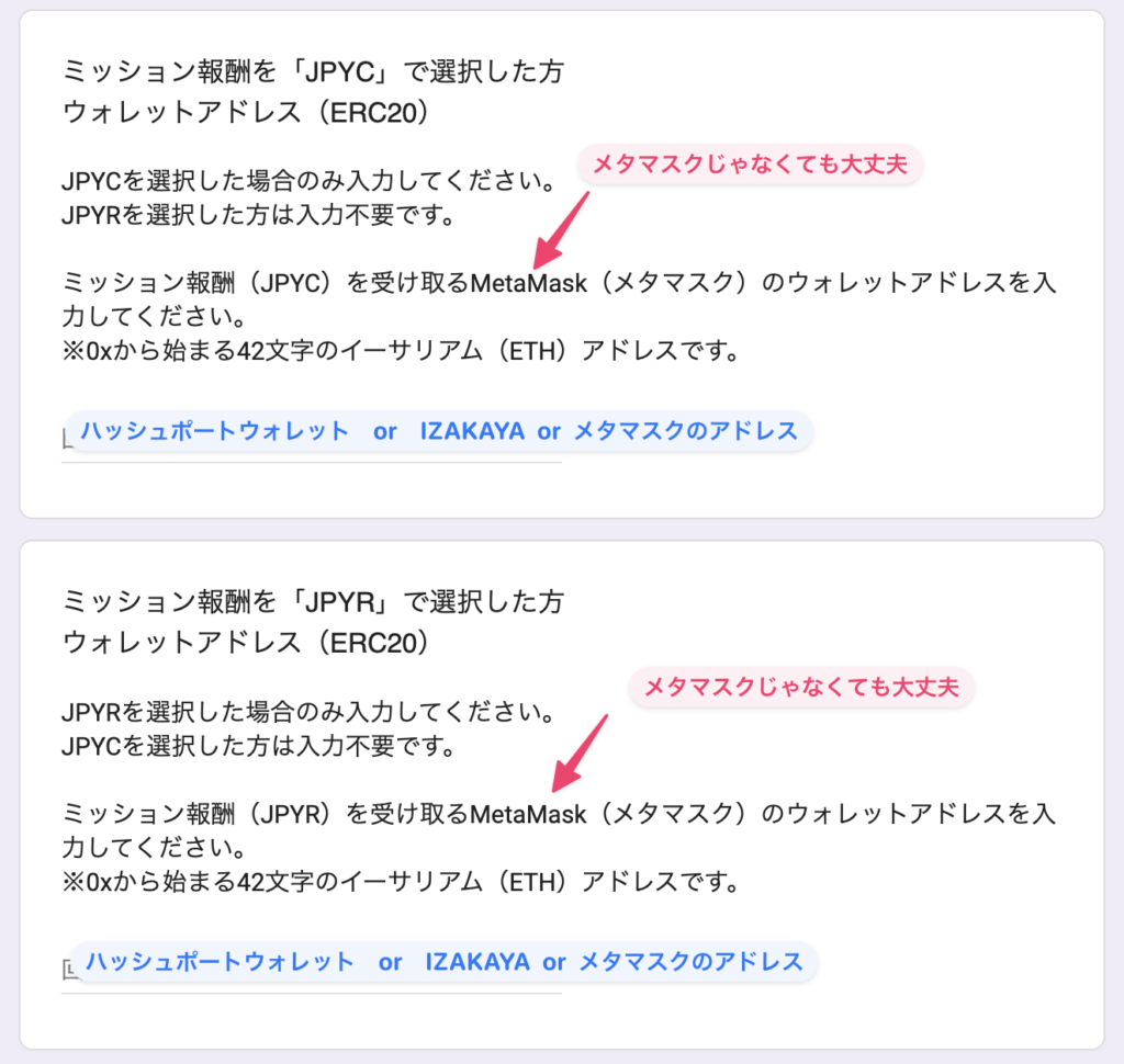 先着方式の判定は、アンケート入力日時順です。KYC完了次第、即申請フォームから入力しましょう。 入力する箇所は一旦はこれだけでいいです。他のミッションの分は後からクリアしたタイミングで修正すればいいだけです