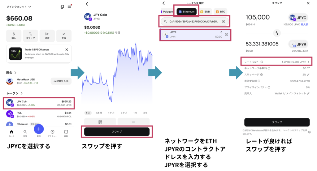 メタマスクでJPYR(or BTCなど)をスワップする