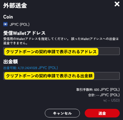 画像はJPYCを選んでいますが、JPYRでもその他の通貨でもやり方は一緒です!!