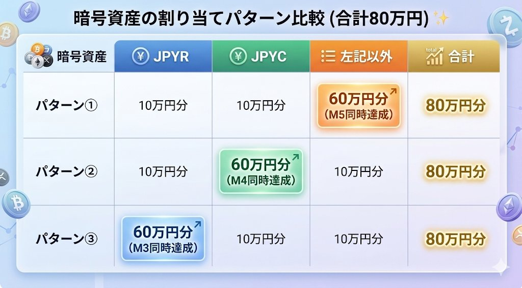MISSION 6については、MISSION 3/4/5のいずれかと重複達成可能となるので、全ミッション達成する場合は下表の3パターンとなり、80万円分の暗号資産等が必要となります。