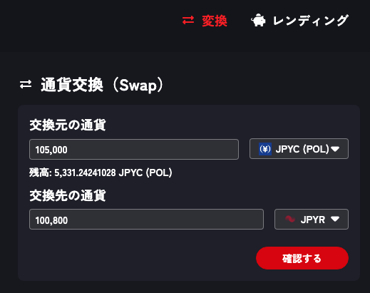 JPYR以外の通貨(USDT(Pol)など)に交換する手順も全く同じです!