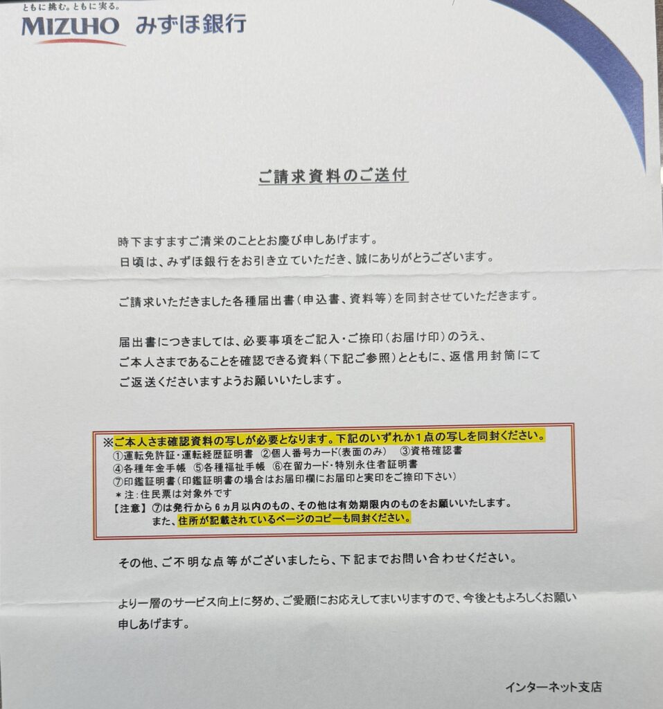 みずほ銀行から書類を受け取りました。定期預金関係変更届・印鑑票(インターネット支店だけでも今回登録が必要になってくる)です。これに加えて、本人確認書類のコピーを提出しなければなりません。