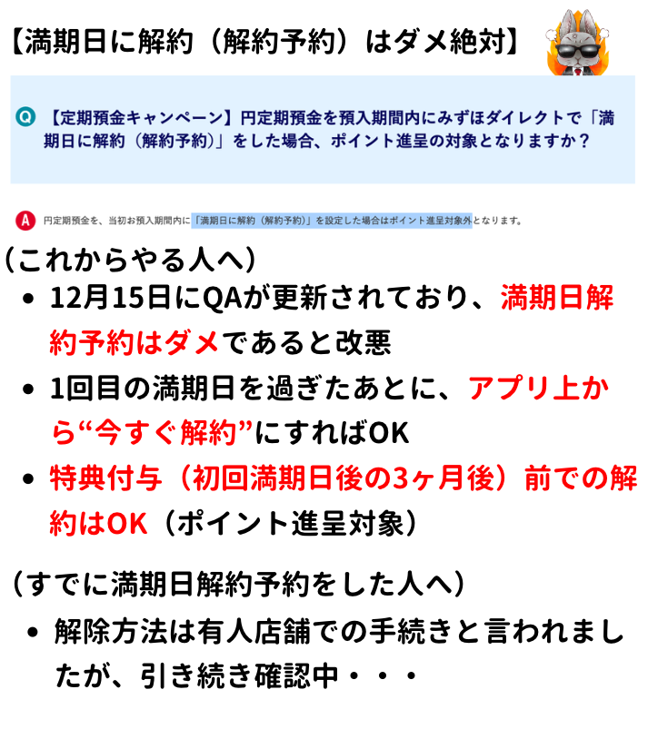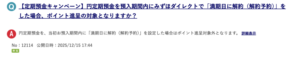 その内容を見ると、「満期日に解約(解約予約)」をした場合には、ポイント対象外になってしまうことが追記されております(2025年12月15日17:44)