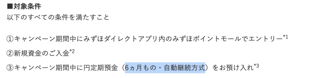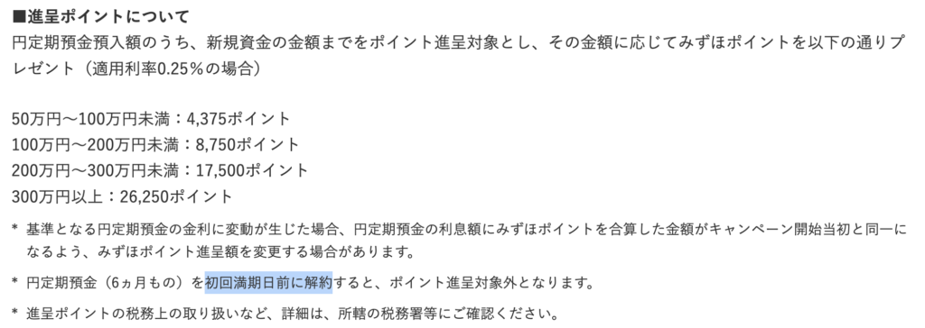 なんと、円の定期預金(6ヶ月もの)を預け入れることによって、その預け入れた特典対象金額によって、通常の利息に加えてみずほポイントがもらえるキャンペーンになっております。