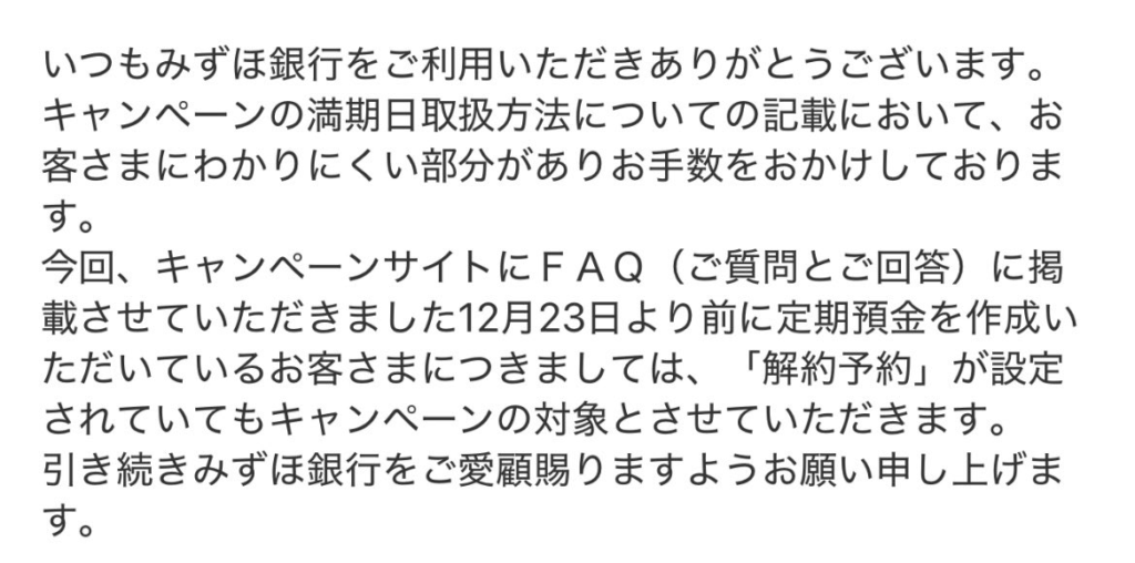 「みずほ銀行からの回答によると12月23日までに定期預金を作成した人については、なんと解約予約を設定していてもキャンペーンの対象となる旨が回答されました。」