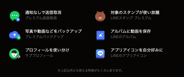- プレミアムバックアップ: トーク履歴や画像を100GBまで自動バックアップ(スマホ買い替え時も安心)
