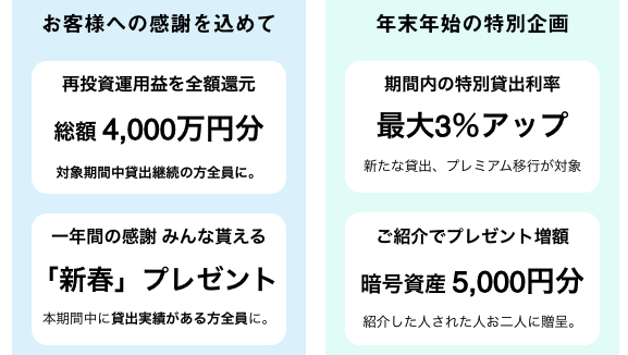 既存利用者だけでなく「10%を超える年利」「豪華「新春」プレゼント」「紹介特典」など、新規利用者でも特典を狙えるチャンスです!