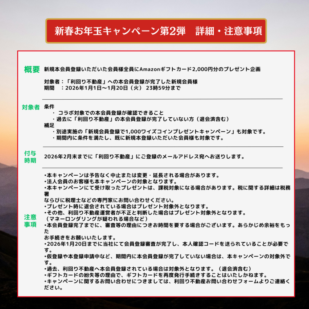 【免責事項】 本記事は「利回り不動産」および当該ファンド、キャンペーン情報の提供を目的としており、特定の投資商品を推奨・勧誘するものではありません。 不動産クラウドファンディングは元本が保証される金融商品ではありません。記載されている想定利回りや運用期間は、あくまで予定・目安であり、確実に保証されるものではありません。 投資に関する最終的な決定は、必ず公式サイトの重要事項説明書等をご確認の上、ご自身の判断と責任において行ってください。当ブログのご利用により生じた損失等に対し、運営者は一切の責任を負いかねます。