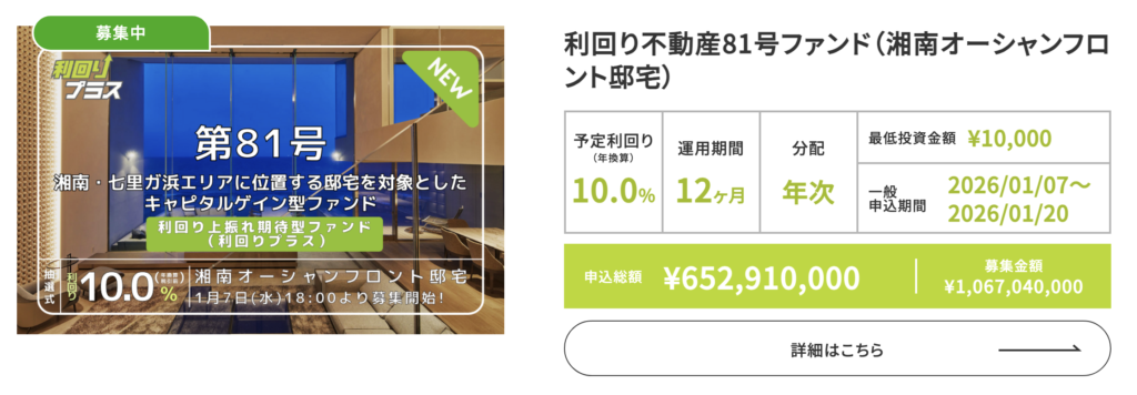 期限は2026年1月20日(火)までです。 大型ファンドで当選チャンスも大きいこの機会に、利回り不動産デビューしてみてはいかがでしょうか?