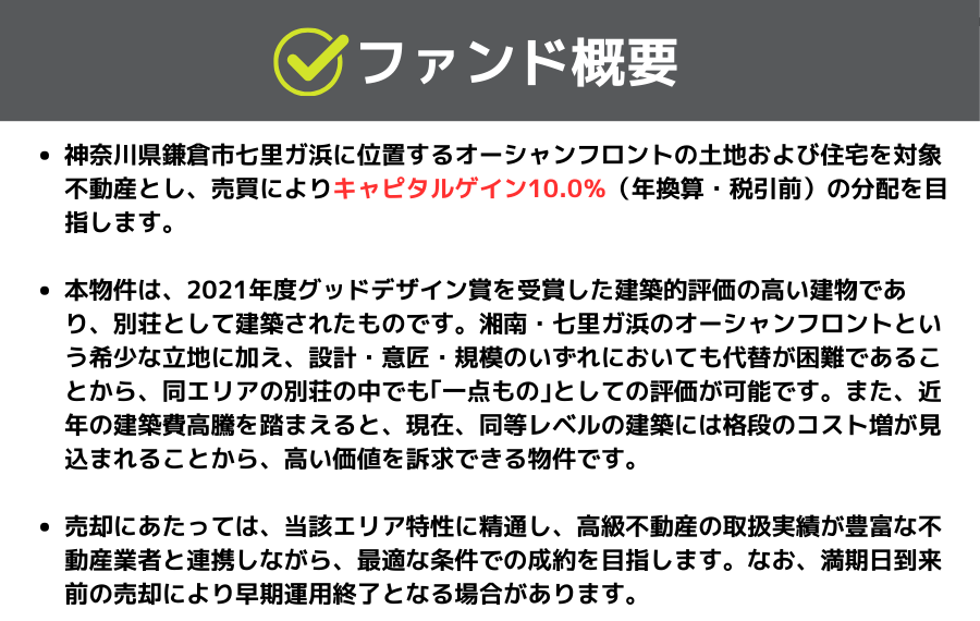 • ファンド名:湘南オーシャンフロント邸宅(81号ファンド)