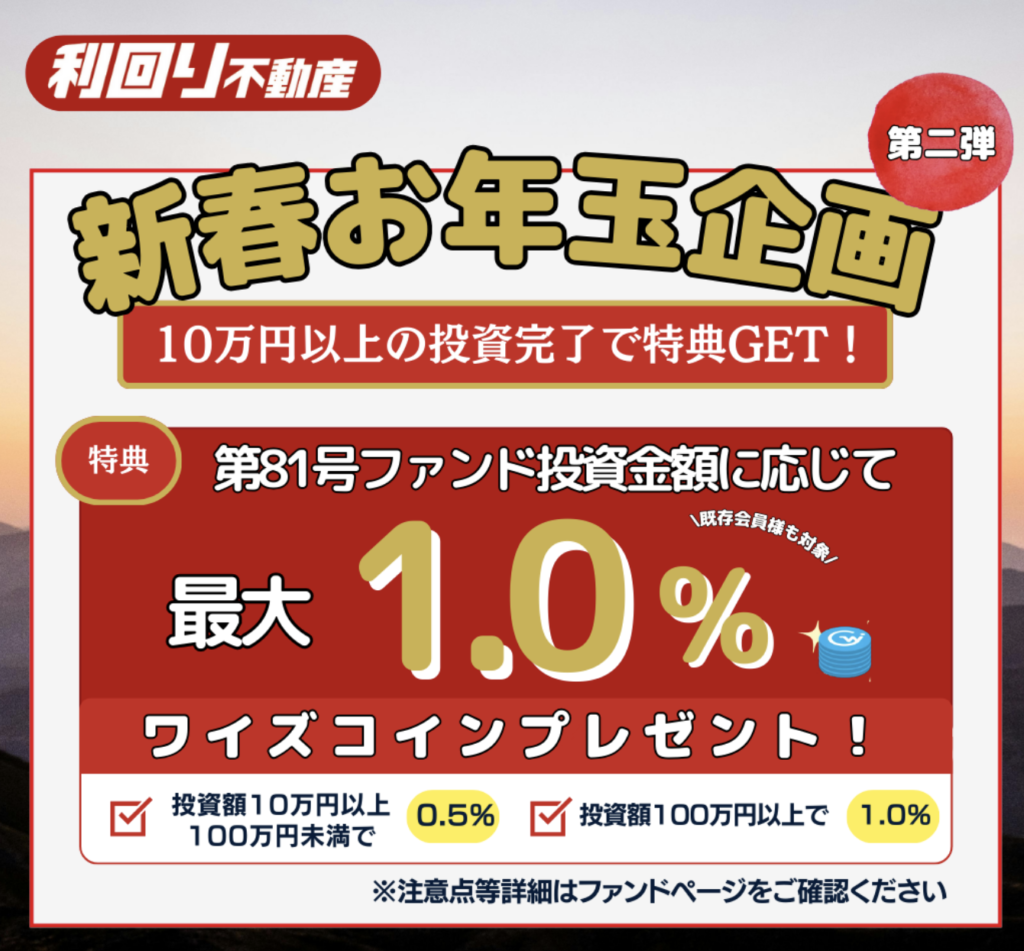 新年早々、「利回り不動産」からとんでもないお年玉特大キャンペーン高利回りファンドが登場しました!