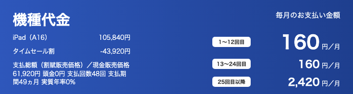 - 最新iPadが実質・月々160円! 「新トクするサポート+」を利用することで、最初の24ヶ月間は月々160円(総額たったの3,840円)で利用できます。25ヶ月目に端末を返却すれば残りの支払いは不要。もちろん返却時の手数料(特典利用料)も無料です!