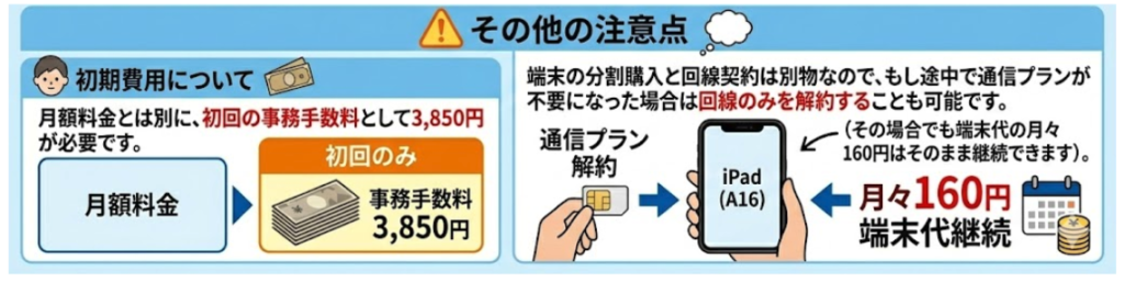 - 将来的に回線が不要になったら? 端末の分割購入と回線契約は別物なので、もし途中で通信プランが不要になった場合は回線のみを解約することも可能です(その場合でも端末代の月々160円はそのまま継続できます)。