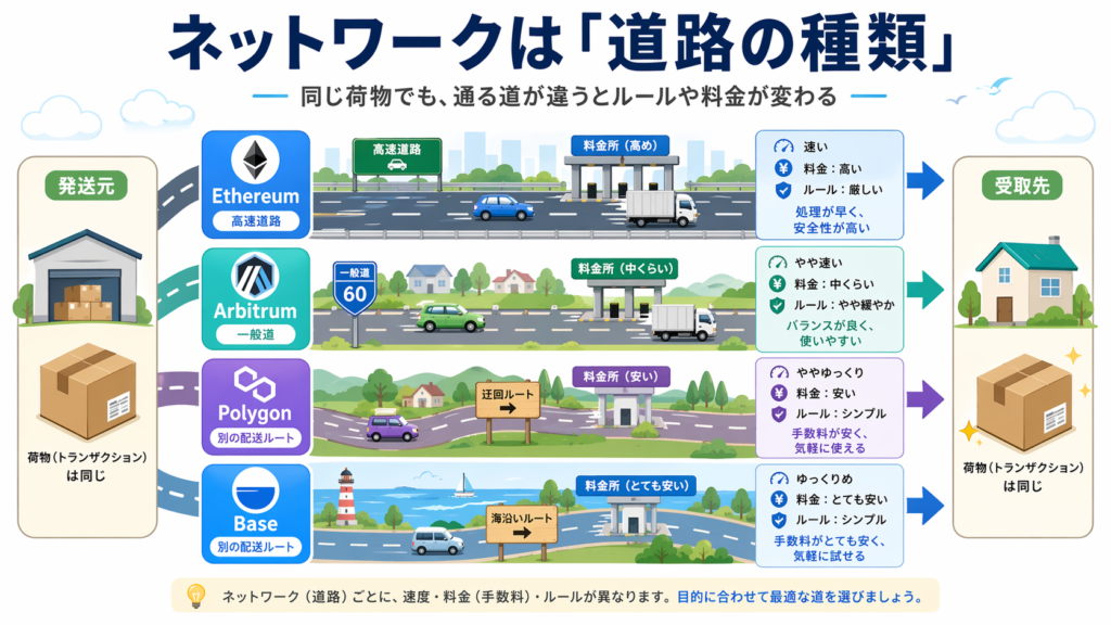 MetaMask などのウォレットでネットワークを切り替える場面があるのは、まさに「今どの道路を見ているか」を切り替えているからです。