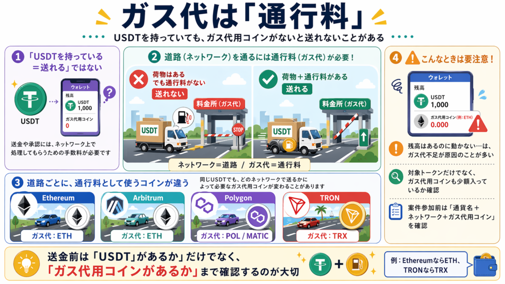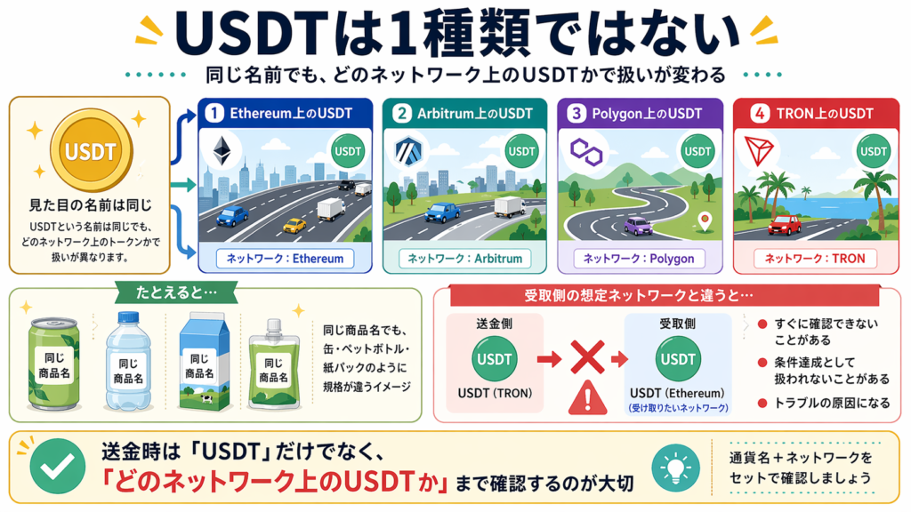 同じUSDTでも、どのネットワーク上のものかで扱いが変わります。