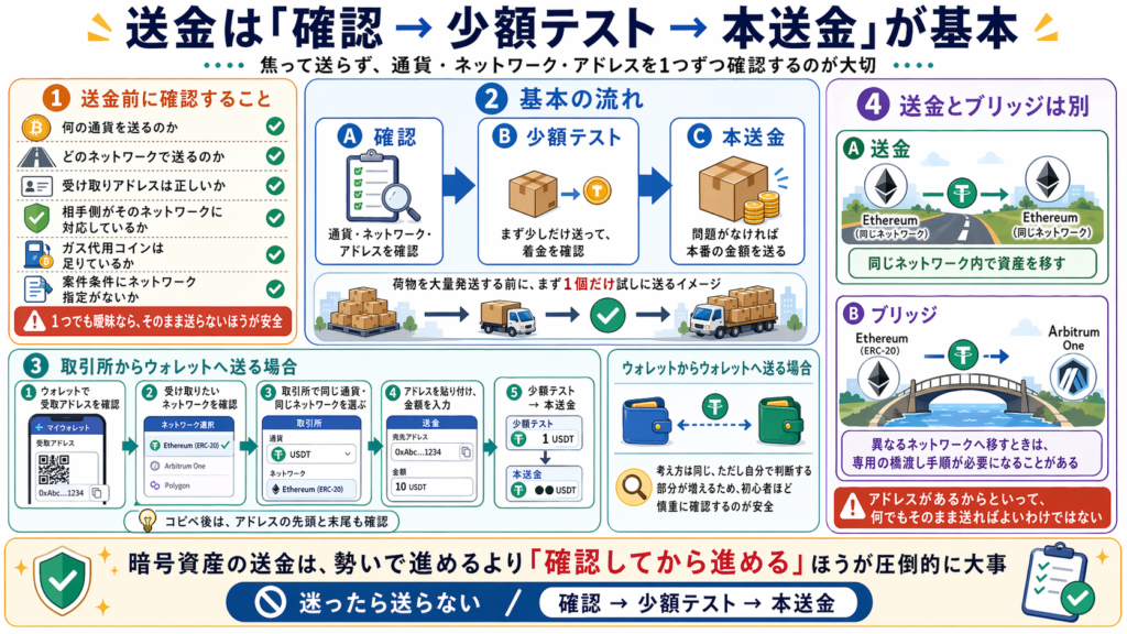 特に初心者がつまずきやすいのが、ネットワーク、送金方法、着金確認のやり方です。