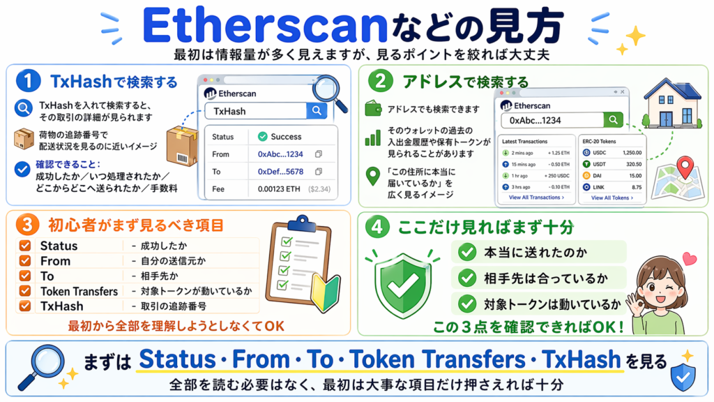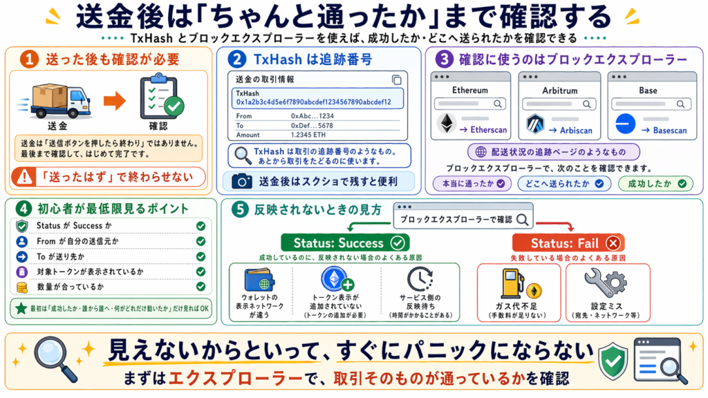 送金後に不安になったら、TxHash を使って Etherscan などで確認すれば、