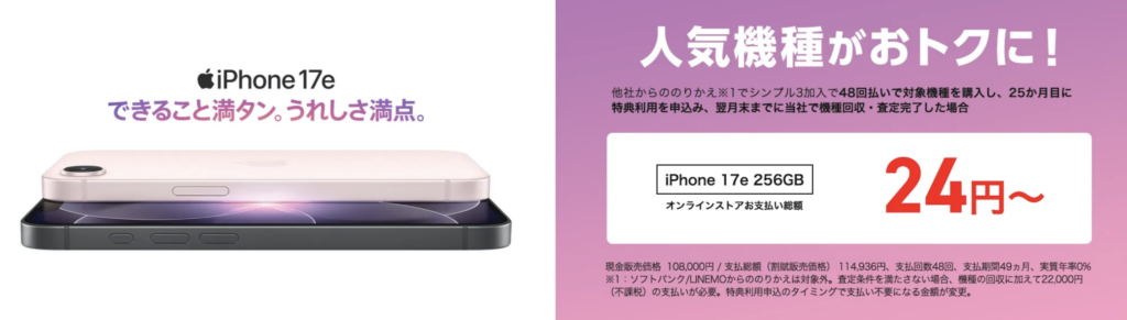 今回のキャンペーンの目玉は、最新のiPhone 17e(256GBモデル)