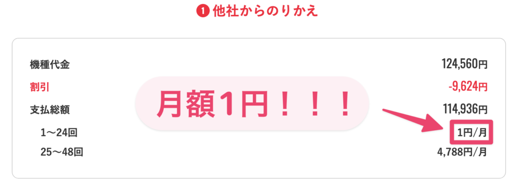 48回払いで契約し、25ヶ月目に特典を利用して端末を返却すれば、残りの支払いが免除されます。つまり、2年間は「月額1円」だけで最新のiPhoneが使えるというわけです!