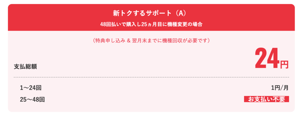 • 新トクするサポートの利用:48回分割で購入し、25ヶ月目以降に端末を返却する必要があります。